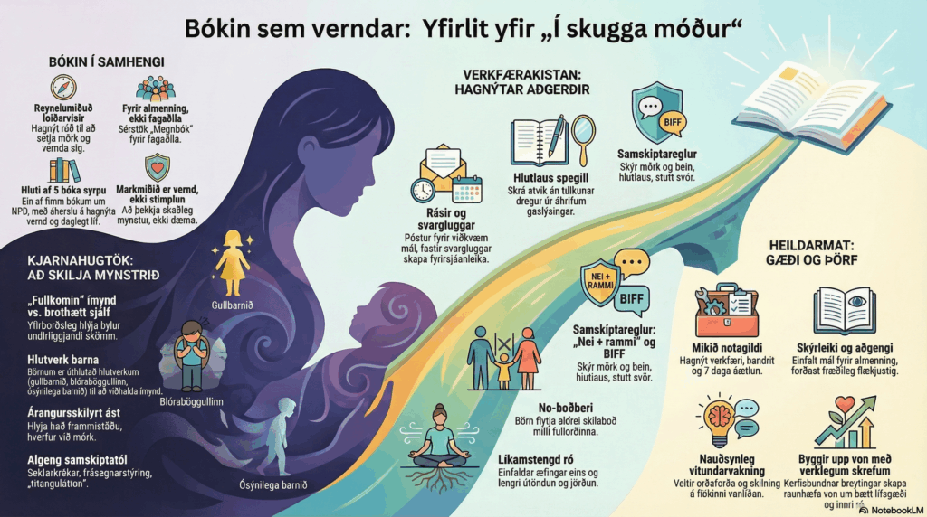 Þessi texti er hannaður til að gefa þér skýra innsýn í bókina „Í skugga móður“ og hjálpa þér að meta hvort hún eigi erindi við þig og þínar aðstæður. Markmiðið er að draga saman kjarnann í þessum reynslumiðaða leiðarvísi, svo þú getir tekið upplýsta ákvörðun um hvort verkfærin sem boðið er upp á geti nýst þér til að skapa meiri ró í lífi þínu.